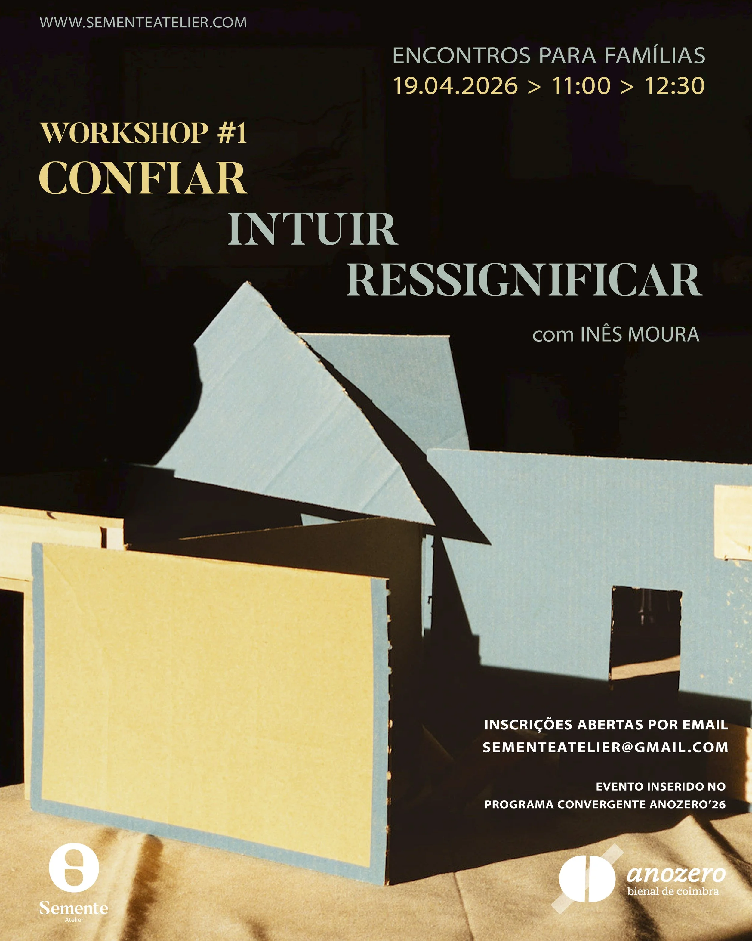 Três oficinas que exploram estes verbos como práticas do território da infância, da criação e da arte. A partir da experimentação, da imaginação e do brincar, é feito um convite a confiar no que ainda não se conhece, a deixar que a intuição do gesto fale mais alto do que a racionalidade do método e a ressignificar, a partir do cuidado do olhar, para assim transformar e atribuir sentido. -